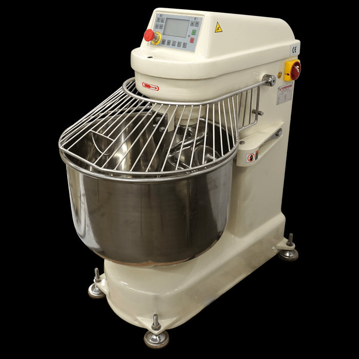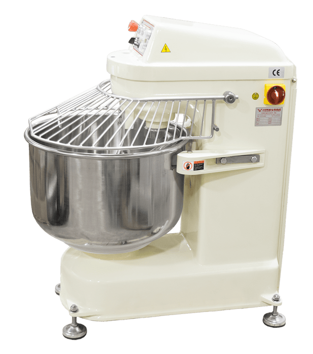 The spiral mixers meet every baker’s challenge: high-capacity, high-efficiency machines at an affordable price. Their exceptional reliability make it ideal for busy cooks by decreasing mixing times and maintenance. This mixer makes a variety of dough from bagels to pizza. These spiral mixers imitate hand kneading and rolling motions. The gentle coordinated movement of bowl and agitator keeps dough cool while mixing for consistent texture. Dough does not over-develop and blends in half the time as a comparable planetary mixer! With dual 30 minute timers and a 3-mode reversible mixing bowl (clockwise, stop, counter-clockwise), your dough can be mixed to your perfection! Safety guard has to be down completely in order for machine to turn on. Front guard has an opening for adding ingredients while mixing. A 1 year warranty for parts is included.
