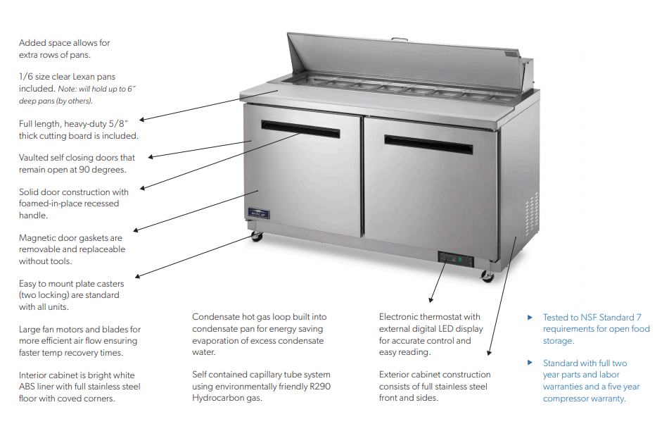 The Arctic Air AMT60R one door mega-top door sandwich prep table is designed to bring you real, commercial food service grade performance at a truly incredible value. Features include high output fan motors, electronic thermostat with external digital display, bottom mounted compressor, and front accessible, bottom mounted condensing unit mounted on slide out rack for easy maintenance/cleaning. Three epoxy coated, adjustable shelves and locking casters come standard with this model. Doors are self-closing with foamed in place recessed handle. Magnetic door gaskets are removable and replaceable without tools. The AMT60R mega-top sandwich prep table is tested to NSF Standard 7 levels and passed numerous quality control inspections throughout manufacturing process. In addition, before shipping this product is operated and monitored for a minimum of 13 hours. The AMT60R mega-top sandwich prep table is beautifully designed in smooth stainless steel for a look that you would be proud to put in any commercial application. More importantly, our products have many features that are desired in todays commercial food service market.