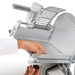 the operator’s hand at a safe distance from the blade while operating the slicer. - A permanently mounted knife ring guard covers the non-cutting side of the blade.